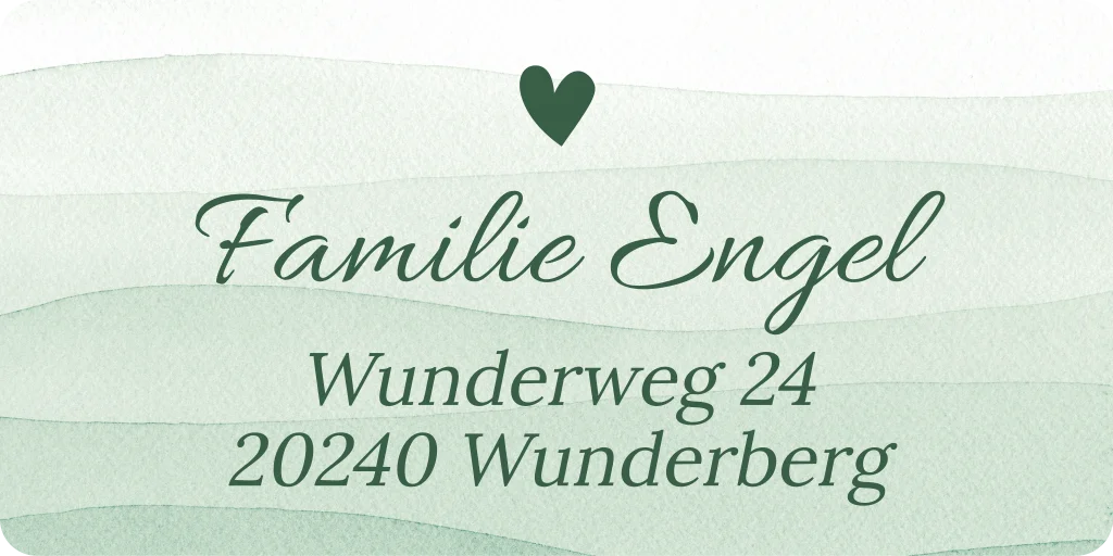 Seicht grüne Aquarellwellen zieren eure Adressaufkleber, passend zu der Ankündigung eures Sprösslings. Perfekt, wenn ihr euren Familiennamen und eure Anschrift nicht händisch auf die Briefumschläge schreiben möchtet. Wählt eine Schriftart und spart Zeit beim Versand.