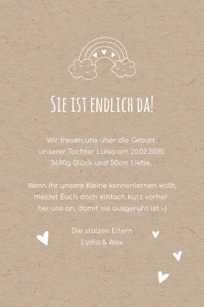 Euer Kind ist da, wie wunderbar! Diese schöne Neuigkeit verschickt ihr zusammen mit den Bildern eures Babys und den Geburtsdaten an Familie und Freunde. Die Karte ist in Kraftpapier-Optik, sodass die Bilder darauf intensiver zur Geltung kommen.