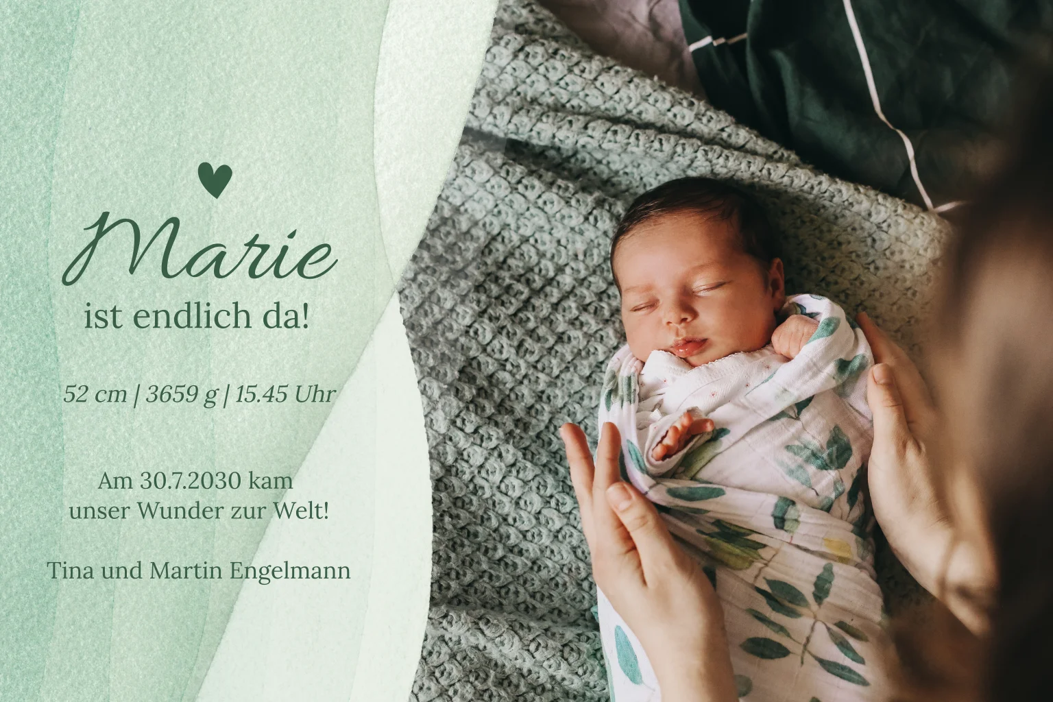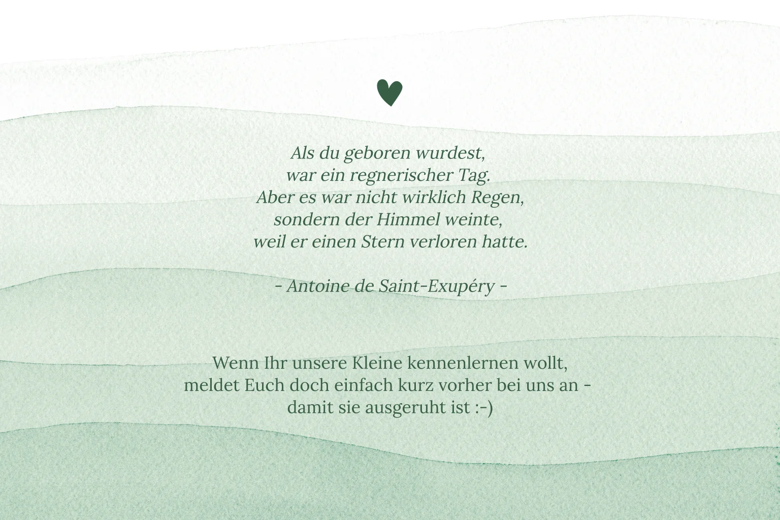 Seicht wie diese hellgrüne Aquarellwelle ist euer Wunder auf die Welt gekommen. Taucht ab in eure Welle der Freude und lasst mit dieser Geburtskarte alle an eurem Glück teilhaben. Bittet um vorherige Anmeldung eurer Besucher, damit ihr ausgeruht seid.