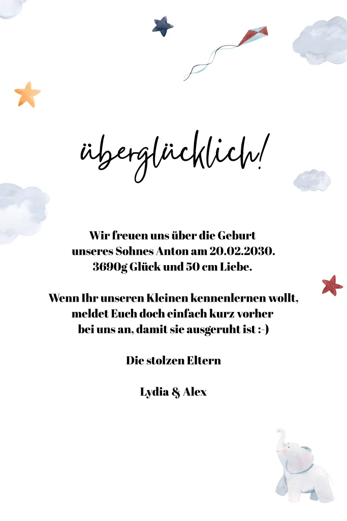 Euer kleines Wunder ist endlich da - wie wunderbar! Teilt dies euren Liebsten mit dieser schönen Karte mit. Voller Freude schwebt der kleine Elefant mit Luftballons in die Höhe und signalisiert eure Freude.