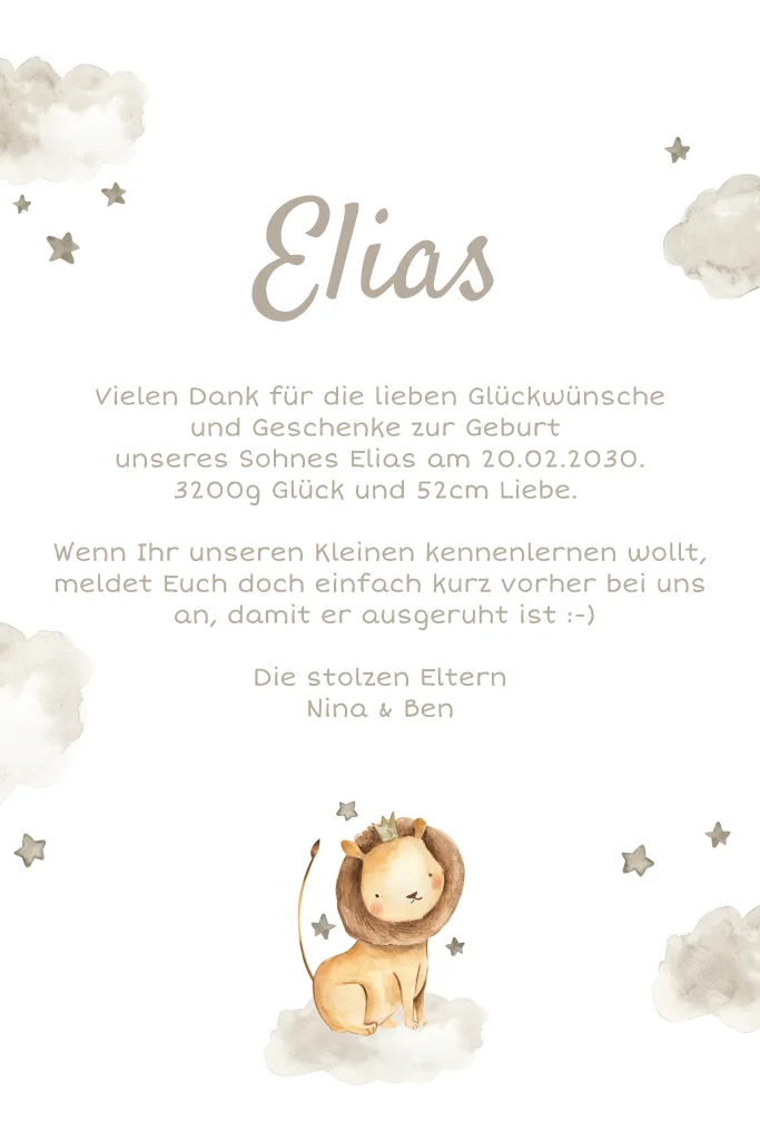 Euer kleines Wunder hat sich ins Leben gekämpft wie ein Löwenbaby. Wohl geschützt vom Löwen verratet ihr den Namen eures Babys in der Aquarellwolke nebst Sternen und dem Mond und den Geburtsdaten. Fügt ein erstes Foto eures Sprösslings ein und teilt euer Glück mit der ganzen Welt.
