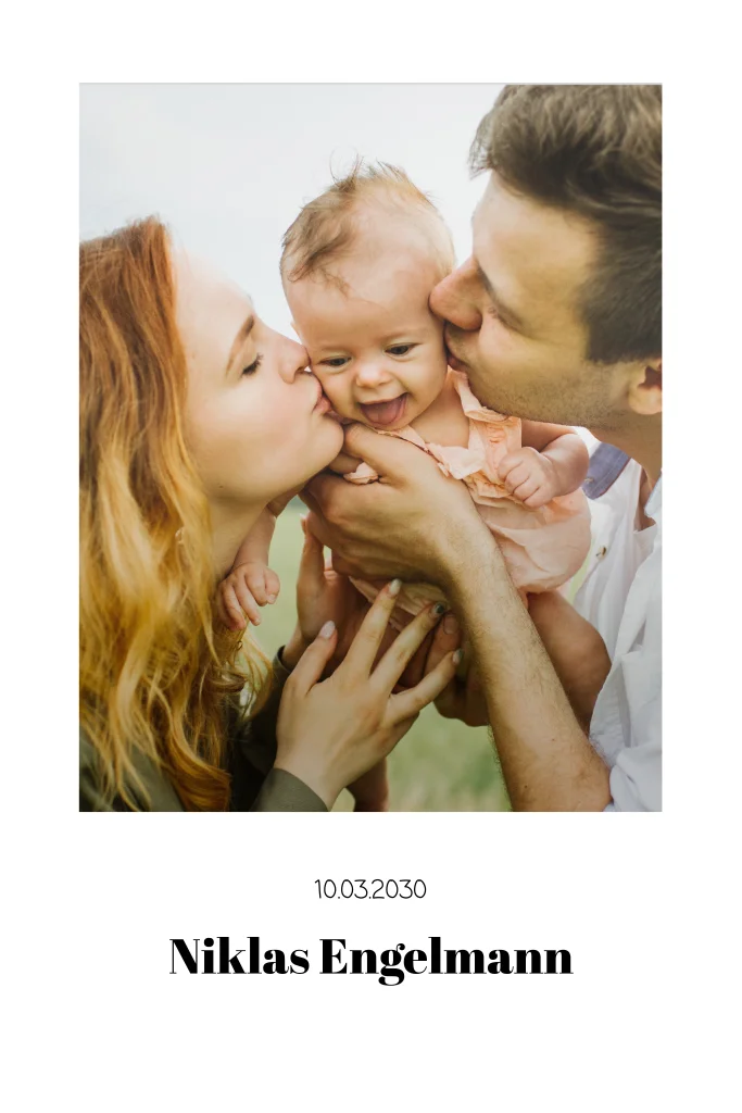 Minimalistisch kündigt ihr die Geburt eures kleinen Wunders an. Ihr könnt euer Glück kaum fassen und wollt es endlich mit der ganzen Welt teilen. Gebt einen Einblick in eure ersten Lieblingsfotos und verratet mit den Symbolen Waage, Wecker und Maßband im Inneren die Geburtsdaten eures Babys.