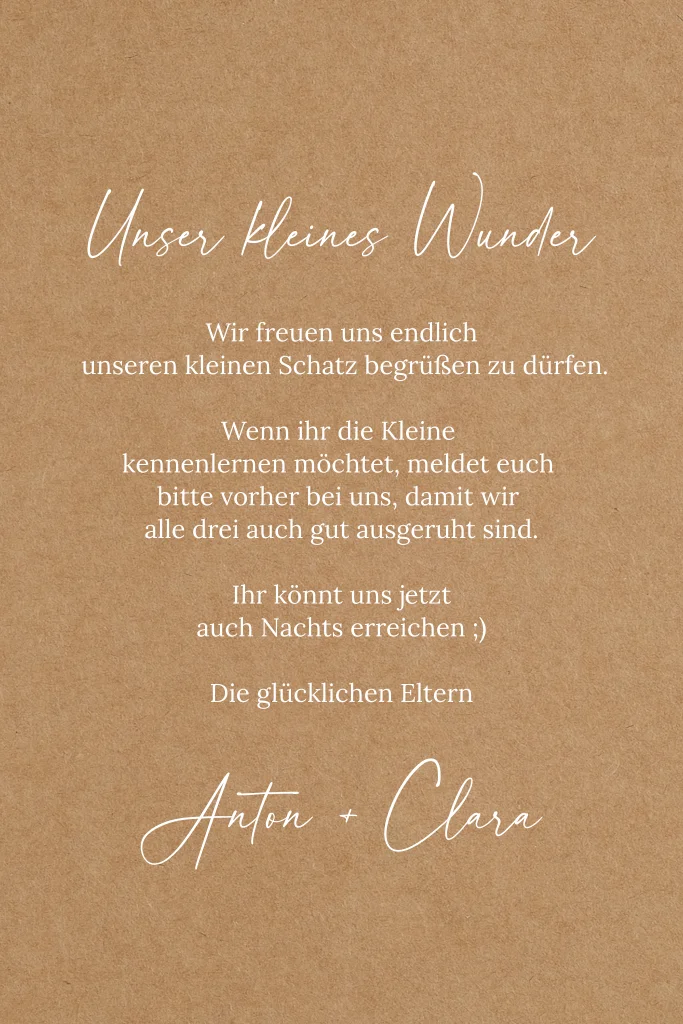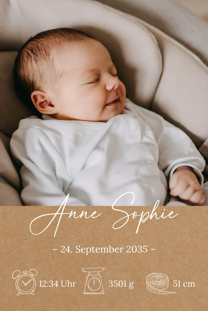 Eine liebevolle Geburtskarte in Kraftpapieroptik mit kleinen Symbolen rundum die Geburtsdaten. Die pure Liebe entfaltet die Babykarte, wenn ihr die ersten Fotos eures Wunders einfügt und überglücklich eure Liebsten an eurem kleinen Wunder teilhaben lasst.