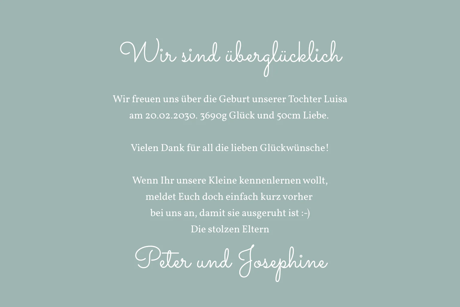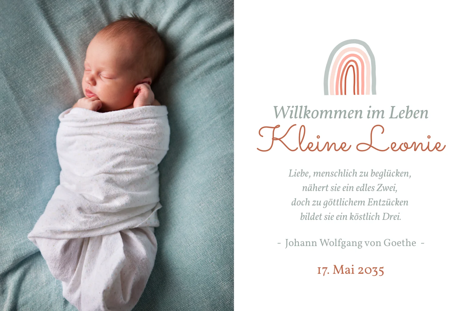 Die Geburt eures kleinen Wunders macht euch überglücklich und eure Welt so bunt wie ein Regenbogen. Heißt mit dieser Geburtskarte und eurem Lieblingsfoto euren Sprössling willkommen im Leben. Bittet darum, dass der Kennenlernbesuch sich vorher anmeldet, damit ihr ausgeruht seid.
