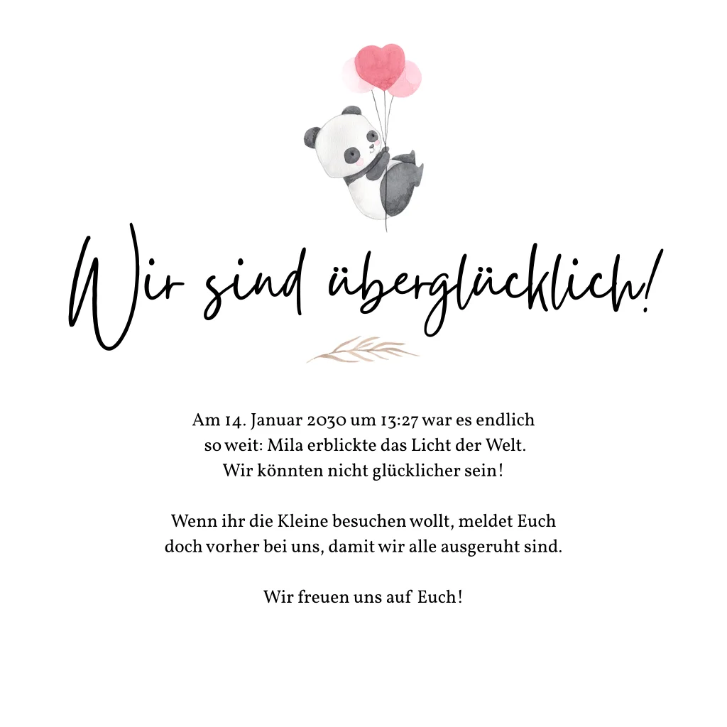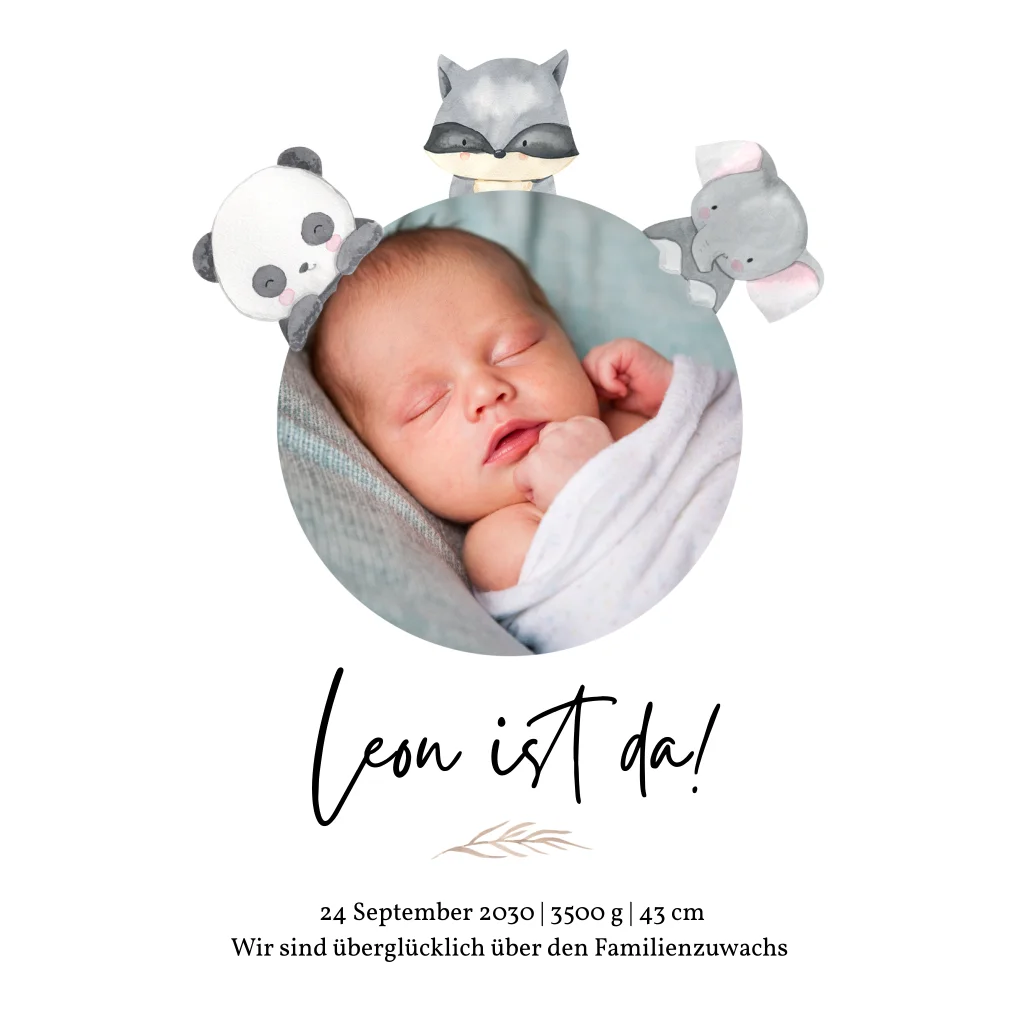 Ein rundes Foto eures Sprösslings umgeben von niedlichen Tieren, die euren Familienzuwachs beschützen. Kündigt mit dem Tierfreundeskreis die Geburt eures kleinen Wunders an und bringt die Herzen eurer Liebsten spätestens mit dem Panda mit Herzluftballons zum Schmelzen. Ihr könntet nicht glücklicher sein.