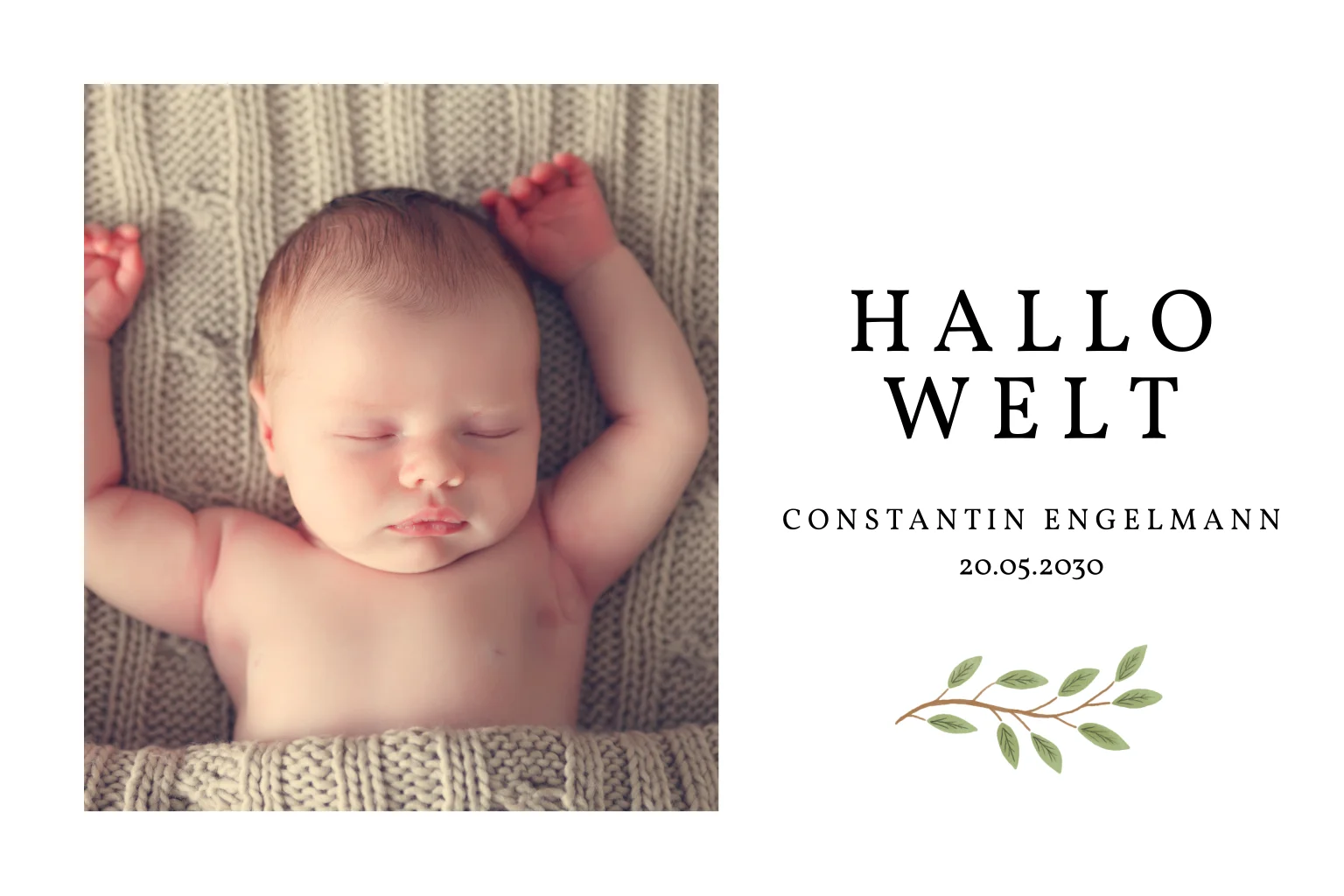 Ein neues Leben wie ein junger Zweig an einem Baum. Hallo Welt! Verkündet überglücklich mit einem Foto die Geburt eures Sprösslings und verratet mit den Symbolen Waage, Wecker und Maßband im Inneren die Geburtsdaten eures Babys.