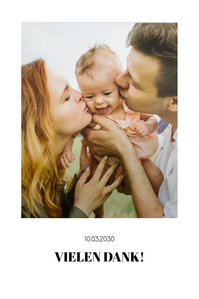 Minimalistisch bedankt ihr euch herzlich für die lieben Glückwünsche und Geschenke zur Geburt eures kleinen Wunders. Ihr könnt euer Glück kaum fassen und wollt es endlich mit der ganzen Welt teilen. Gebt einen Einblick in eure ersten Lieblingsfotos.
