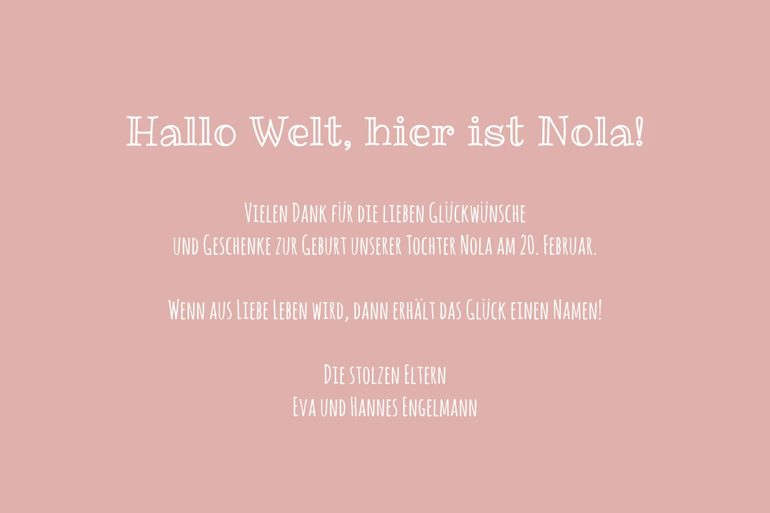 Die Vorderseite der Geburtskarte ist ein bezaubernder Anblick. In sanften Pastelltönen gestaltet, dominiert ein zartes Rosa und Beige das Design. Das Initial eures Babys und die Geburtsdaten sind verteilt und werden mit schönen Bildern abgerundet.