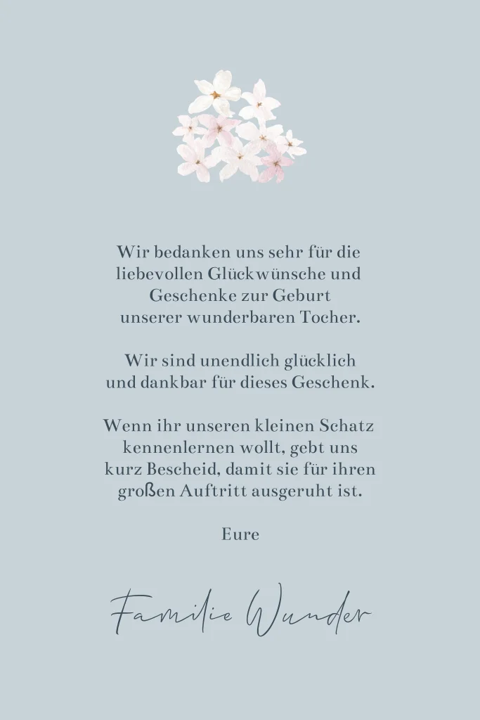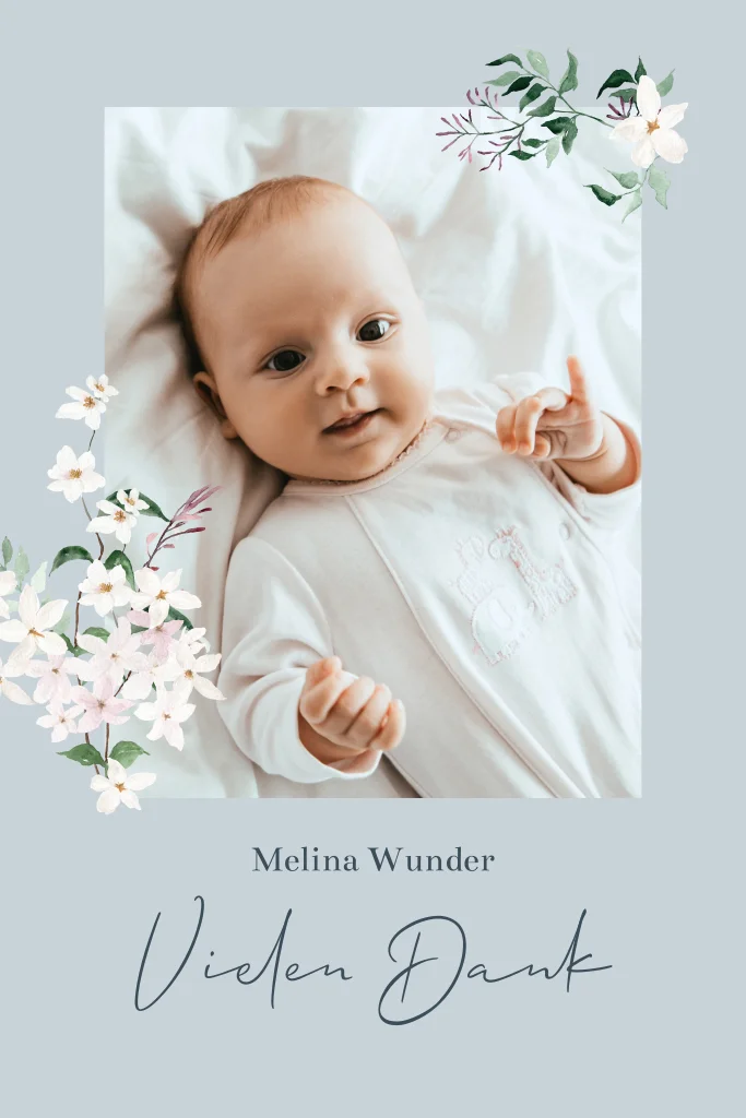 Diese wunderschöne Dankeskarte hat einen zarten grau-blau Ton und ist mit kleinen weißen Blümchen verziert. Platziere ein Foto deines Kindes und schreibe noch das Datum der Kommunion hinzu, um dich bei den Gästen zu bedanken.