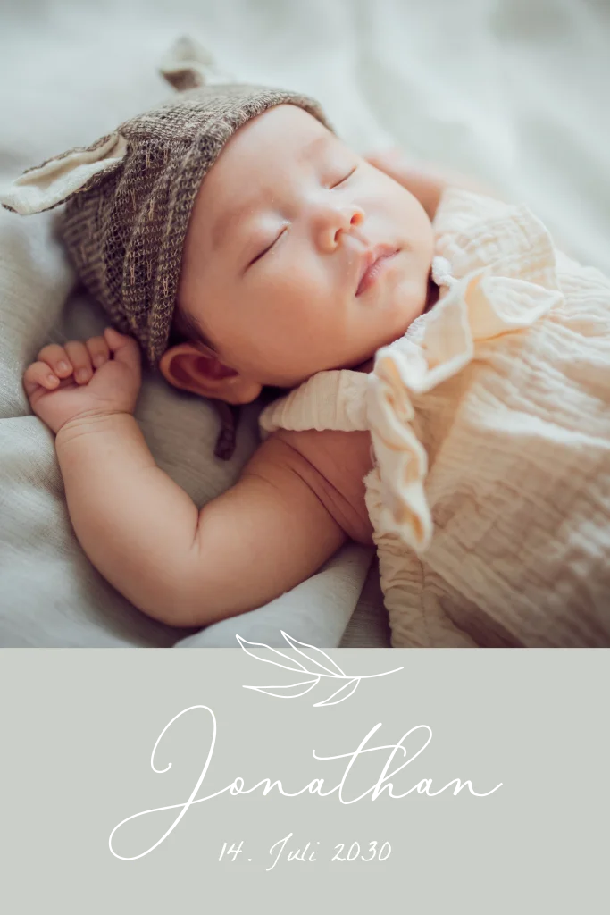 Ein neues Leben wie ein junger Zweig an einem Baum. Bedankt euch überglücklich mit zwei Fotos eures Sprösslings auf Kraftpapieroptik bei euren Liebsten für die zahlreichen Glückwünsche und tollen Geschenke. Die Symbole Waage, Wecker und Maßband im Inneren eignen sich für die Geburtsdaten.