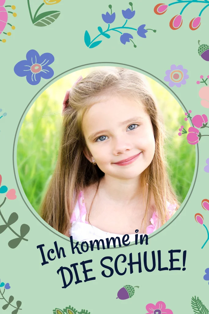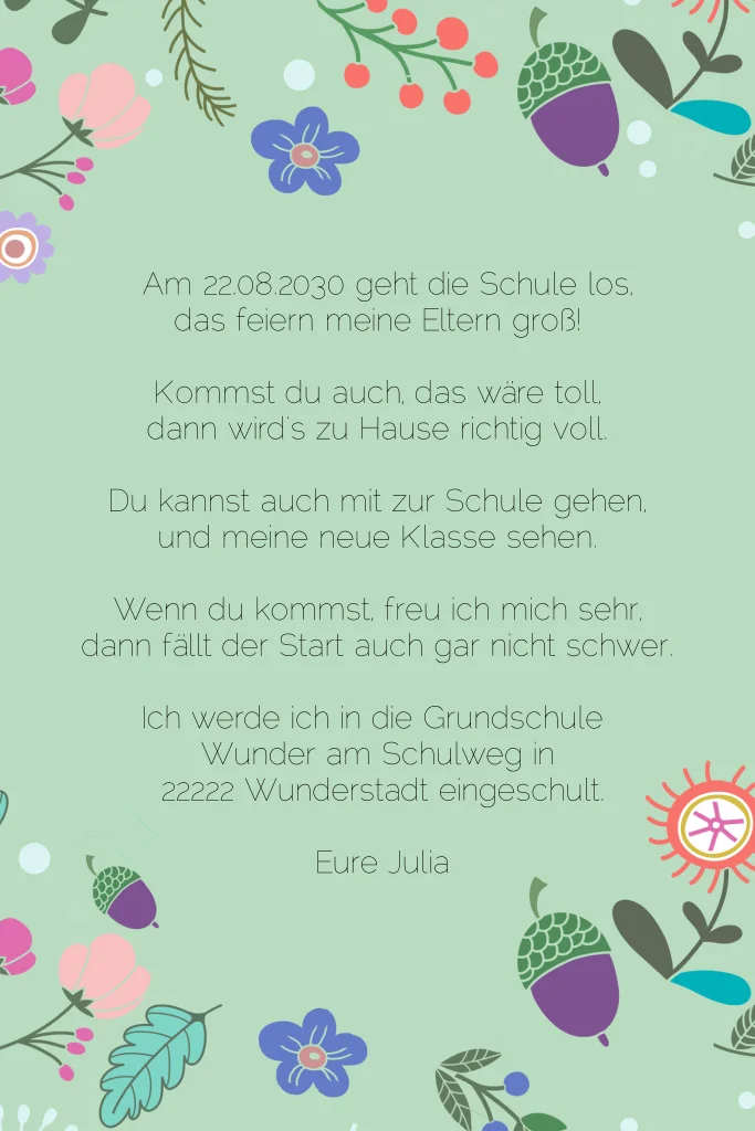 Das Blumenkind wird ein Schuldkind. Ein aufregender und bunter Tag steht dir bevor, den du nicht alleine feiern möchtest. Lasse deine Gäste mit dieser Einladungskarte zur Einschulung mit Blumen auf hellgrünem Hintergrund wissen, dass du in die Schule kommst.