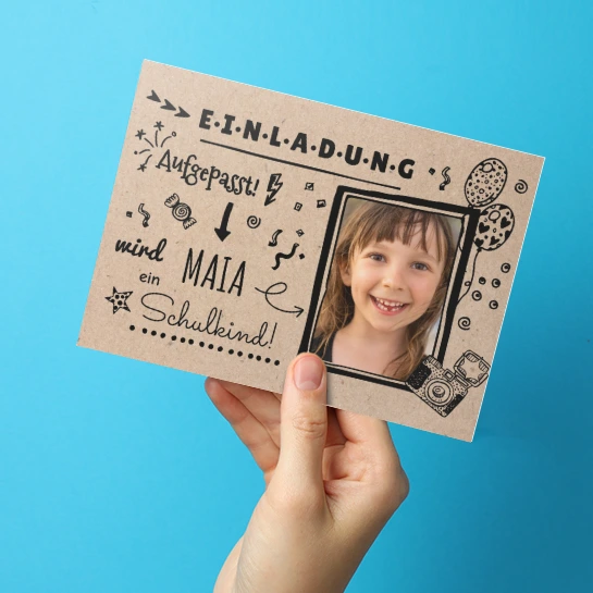 Die modernen Kritzel Kratzel vom Stern über einem Bonbon bis zu Ballons auf Kraftpapieroptik zeigen wie aufgeregt du vor deinem ersten Schultag bist. Lade mit deinem Lieblingsfoto zu deinem aufregenden Einschulungstag ein. Hängt die Partygirlande auf und los geht's!