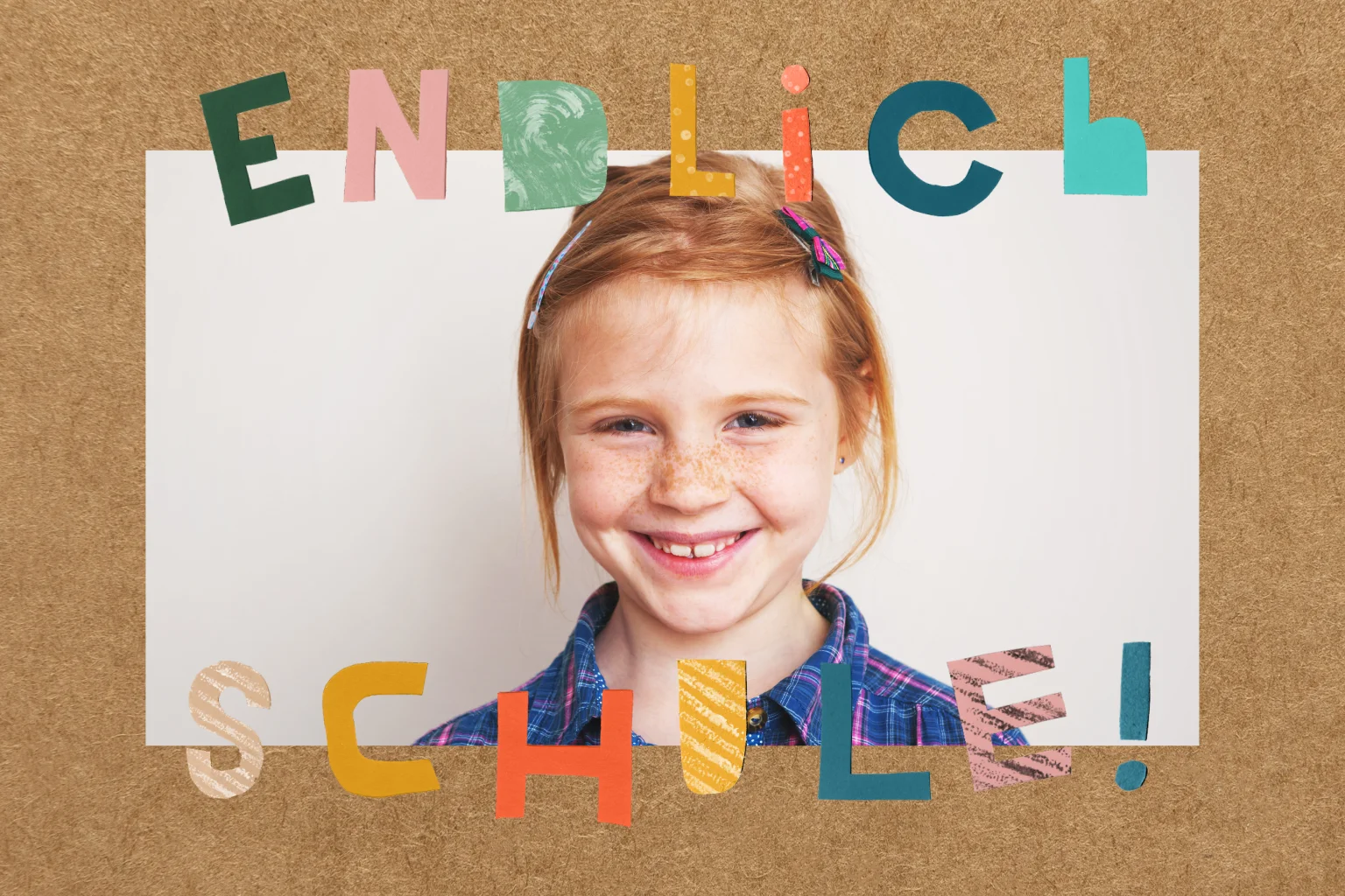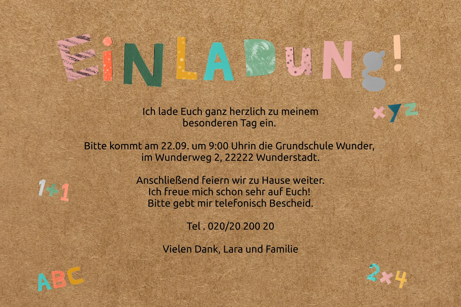 Endlich Schule! Mache den ersten Schultag noch spezieller. Die perfekte bunte Einschulungskarte für deinen Schulstart mit Papierschnipseln auf Kraftpapieroptik. Auf die Stifte und Schere, fertig, los!