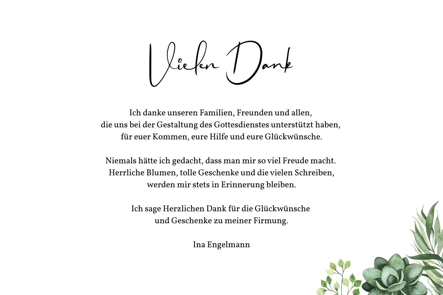 Ein florales Danke nach deiner Firmung mit dem Dankesschriftzug gekrönt von grünen Zweigillustrationen und einem Foto von deinem großen Tag. Rufe ihn bei deinen Gästen in Erinnerung und bedanke dich für die Gestaltung des Gottesdienstes und die zauberhaften Geschenke.