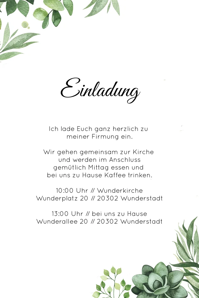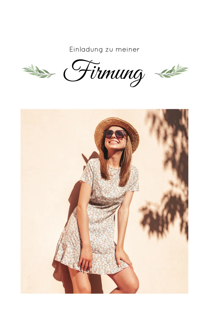 Eine tolle Einladungskarte zu deiner Firmung, floral und stilvoll. Die grünen Pflanzenillustrationen verleihen deiner Einladung Leichtigkeit und symbolisieren den Übergang in dein neues Abenteuer. Wähle deine Lieblingsfotos für die Vorderseite und innen aus.