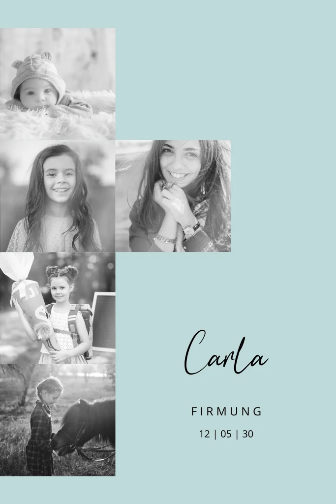Diese schlichte Karte setzt die Bilder deines Kindes so schön in Szene. Du kannst 5 Bilder hochladen, sodass fast ein Kreuz entsteht. Den Einladungstext für deine Firmungsgäste schreibst du einfach in die Innenseite der Karte. Wähle deine Lieblingshintergrundfarbe.