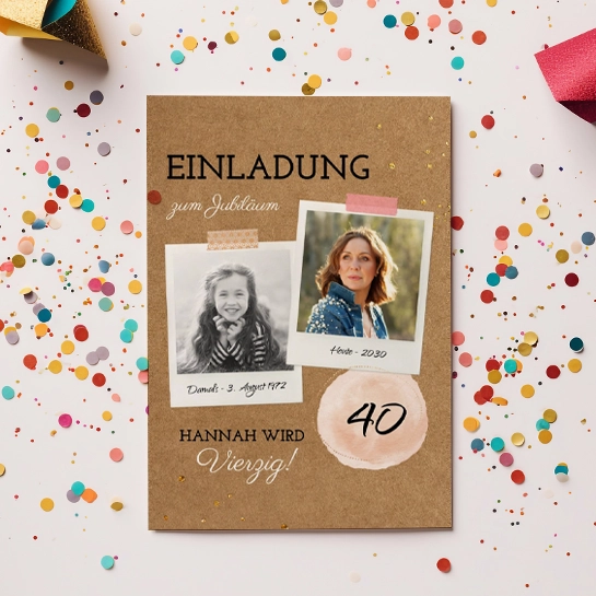 Lade mit dieser stilvollen Einladungskarte zu deinem 40. Geburtstagsjubiläum ein. Platziere in den Polaroids auf der Vorderseite, welche mit einem dekorativen Klebeband auf der Kraftpapieroptik befestigt sind, ein Kindheitserinnerungsfoto und ein aktuelles Foto. Zeit zu feiern.