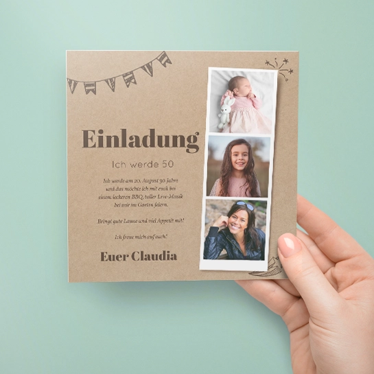 Entstaube die Wimpelkette und lade mit deinem Polaroid Trio mit Fotos aus deinen Lebensphasen auf Kraftpapieroptik zu deinem 50. Geburtstag ein. BBQ und Live-Musik sind nur zwei Programmpunkte deines Ehrentages. Bitte deine Gäste gute Laune mitzubringen und freue dich auf eine grandiose Feier.