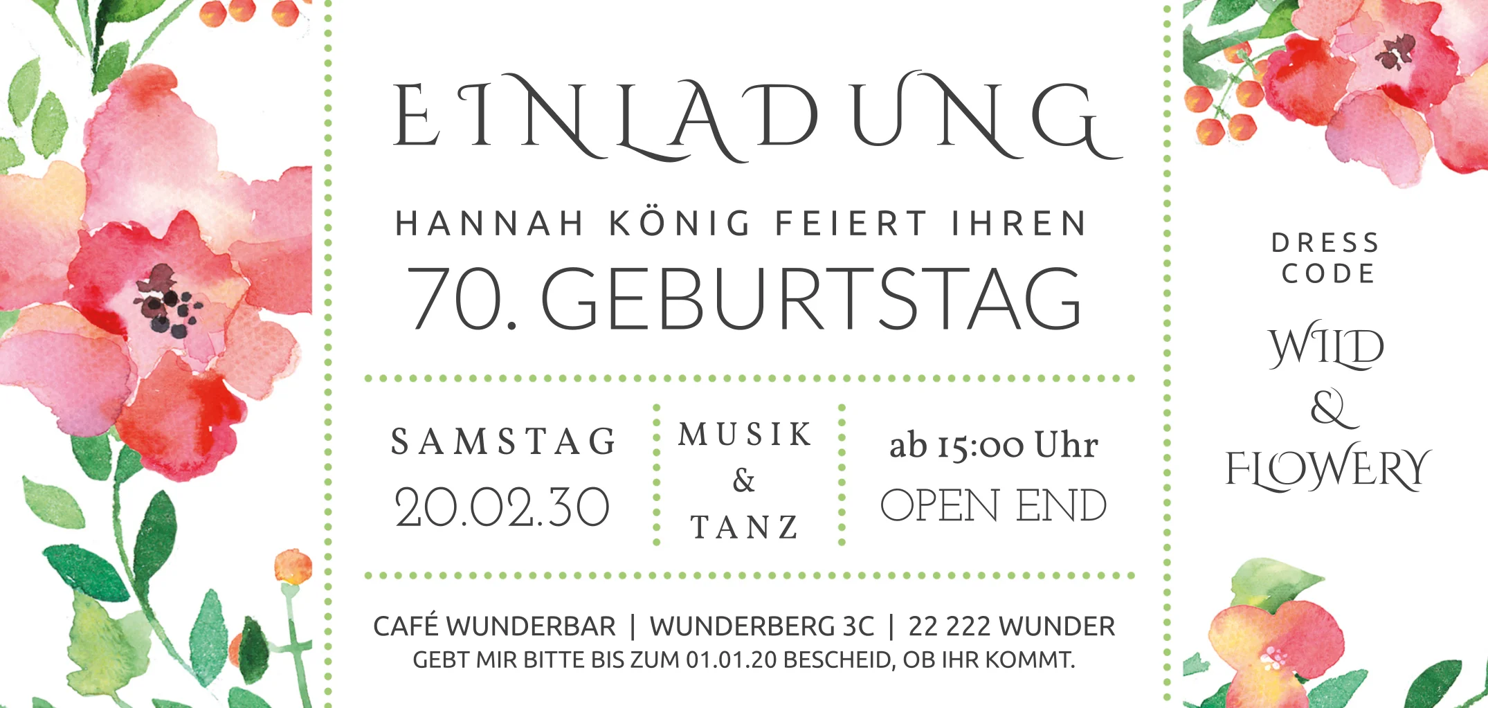 Du liebst Blumen? Dann zeig dies all deinen Geburtstagsgästen mit unserer Einladungskarte Flower Ticket mit feinem Blumendesign. Alle Infos auf einen Blick auf der Vorderseite und rückseitig ein lebhafter Einladungstext in Reimform.