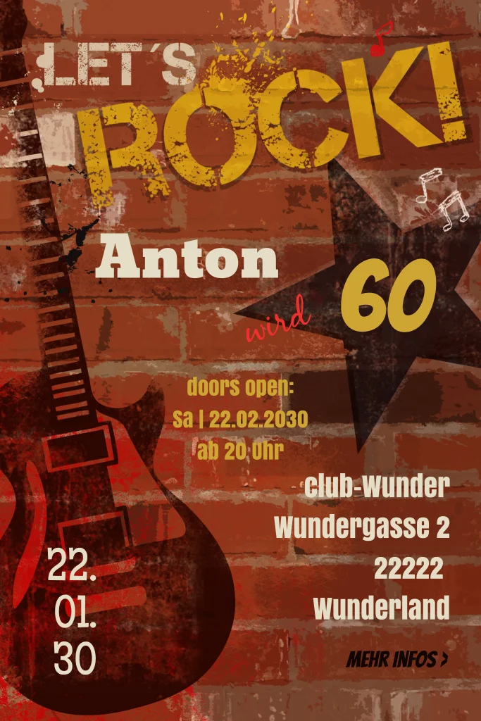 Rebellion und Aufbruch sind die Schlagwörter des Rock´n Rolls. Gestalte unsere coole Rockparty Einladung nach deinen Wünschen und lasse auf deiner Geburtstagsparty mal wieder das Mauerwerk bröckeln, denn dafür ist man nie zu alt.