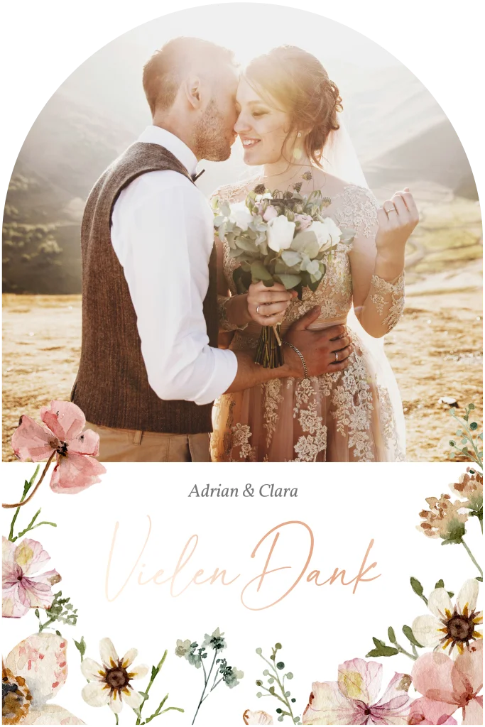 Eure Herzen hüpfen noch immer vor Freude und Dankbarkeit für den tollen Hochzeitstag. Bedankt euch bei euren Liebsten von Herzen mit dieser Dankeskarte im Torbogenformat. Euer Lieblingshochzeitsfoto gepaart mit stilvollen Blumen und dem Vielen Dank Schriftzug in eine unserer Textveredelungen.