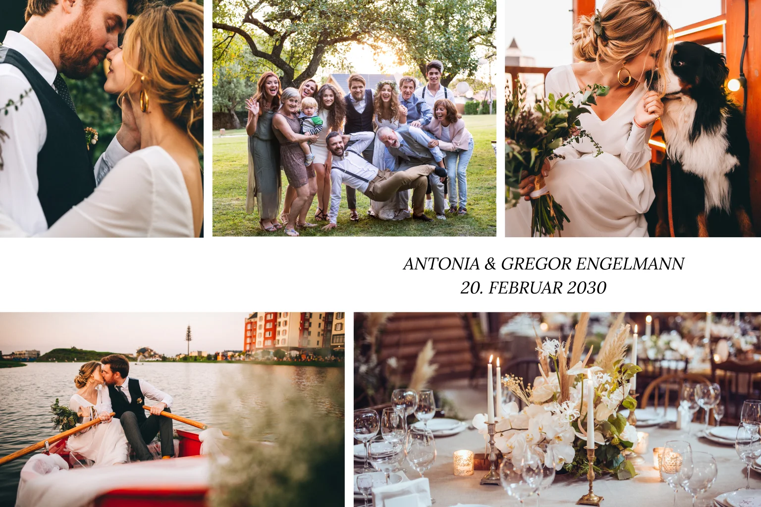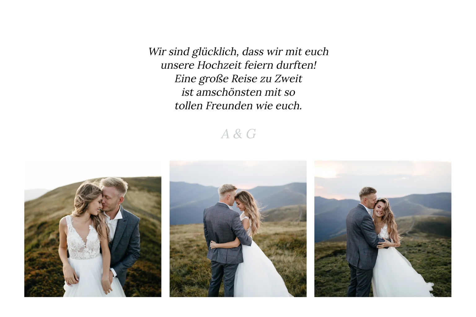 Füllt die Collage auf der Vorderseite mit euren Hochzeitsfotos und erschafft eine schlichte Dankeskarte für den schönsten Tag eures Lebens, der ohne eure Liebsten undenkbar gewesen wäre. Verleiht dem Vielen Dank Schriftzug das gewisse Etwas mit eine unserer Textveredelungen.