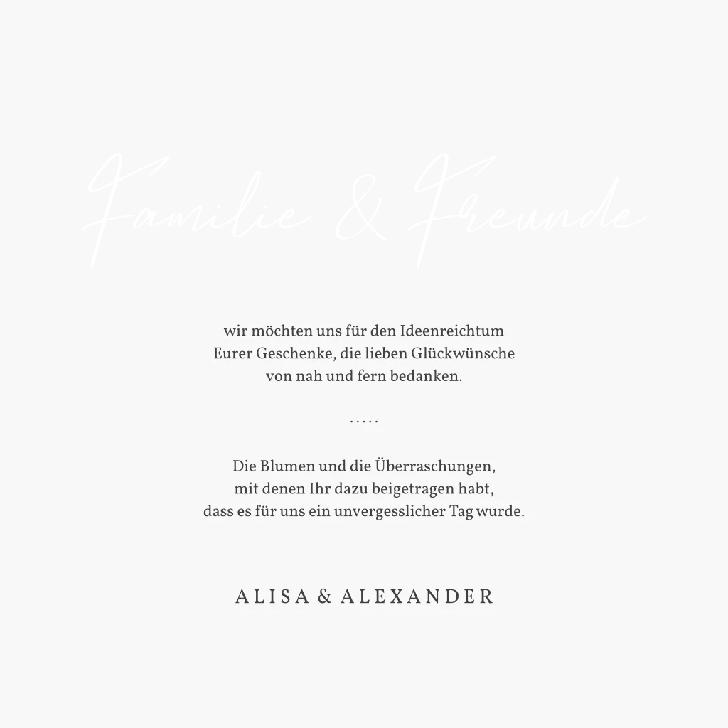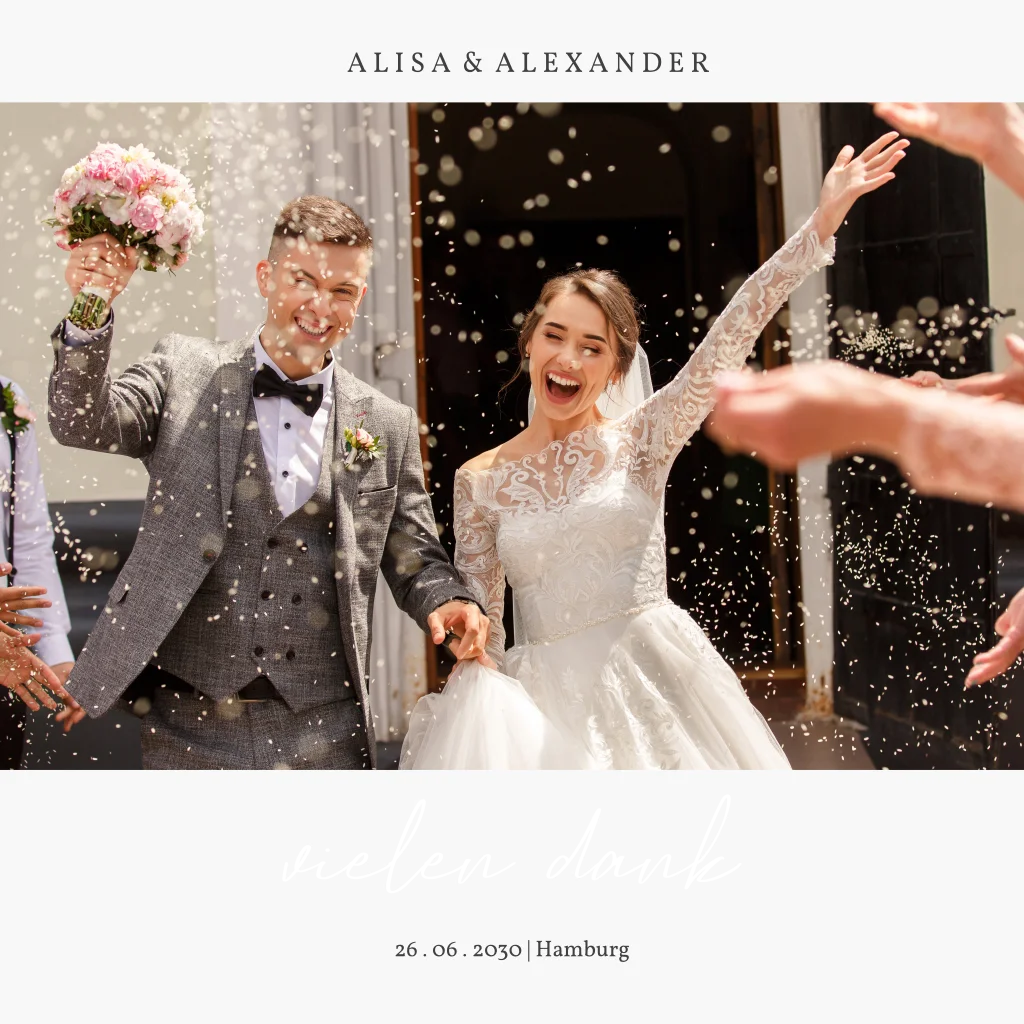 Zeit für ein elegantes Danke nach eurem großen Tag, eurer Hochzeit. Noch edler wird eure Dankeskarte, wenn ihr für den Vielen Dank Schriftzug und die Überschrift eine unserer Textveredelungen benutzt. Erinnert mit tollen Fotos an eure Hochzeit und die grandiose Feier.