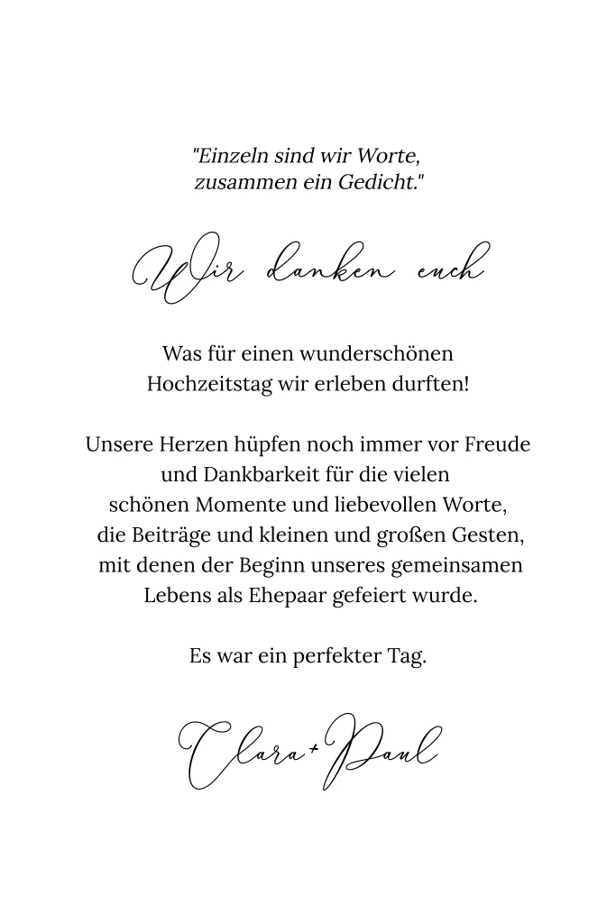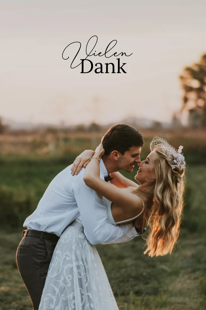 Eure Hochzeit war atemberaubend. Zeit für euch sich pur bei euren Gästen zu bedanken ohne Beiwerk. Lasst eure Hochzeitsfotos für sich sprechen und bedankt euch für die großartigen Glückwünsche und die herzallerliebsten Geschenke.
