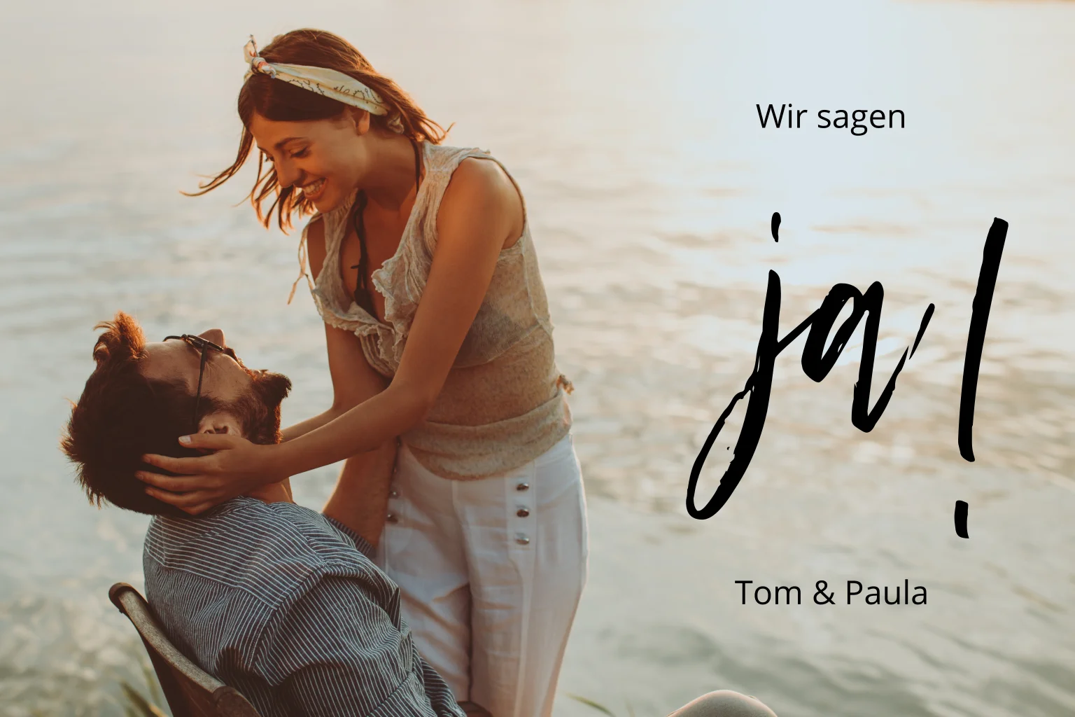 Ruft es in die Welt: Wir sagen ja! mit eurem Lieblingsfoto. Ladet eure Liebsten mit dieser zauberhaften Einladungskarte mit dem geschwungenen Ja und Love in eurer Wunschfarbe zu eurer Hochzeit ein. Platziert innen ein weiteres Foto, gehalten von Fotoecken in der Farbe eurer Wahl.