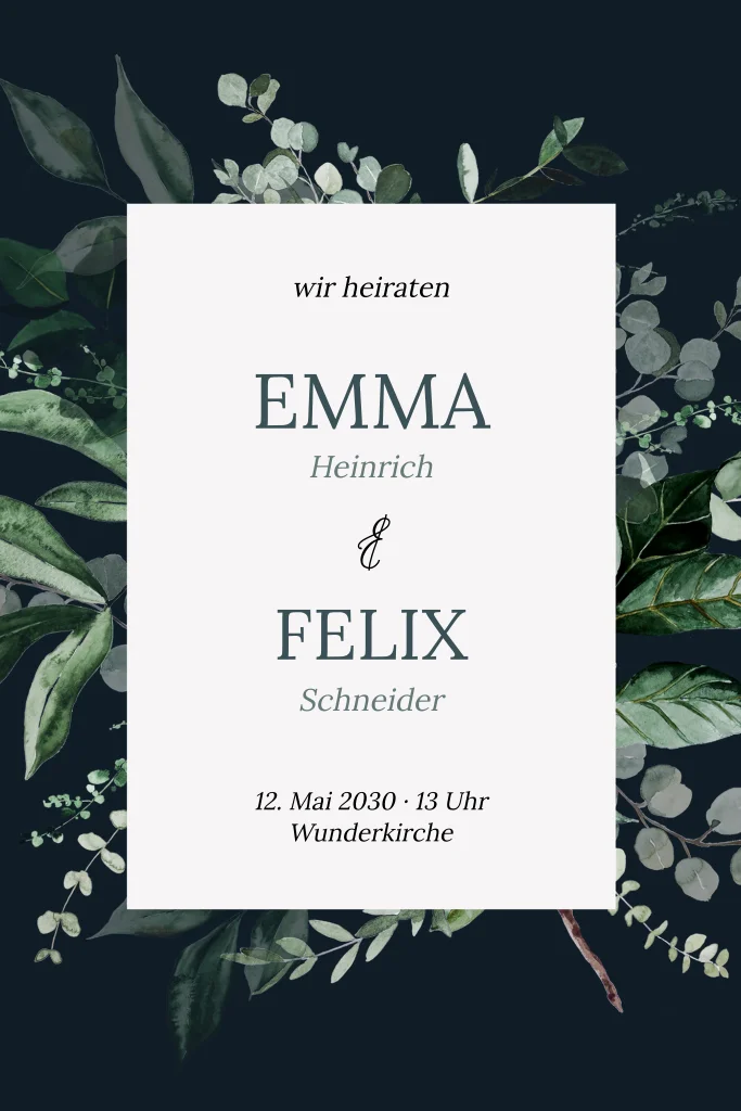Hübsches Blattwerk und Eukalyptus auf dunkelblau umschmeicheln euer Vorhaben, eure Namen und das Hochzeitsdatum eurer Wahl. Ladet romantisch zu eurer Hochzeit ein und verzaubert eure Liebsten bereits mit der Einladungskarte. Freut euch auf einen unvergesslichen Tag.