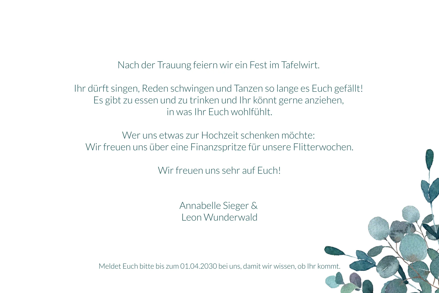 Diese wunderschöne Einladungskarte zur Hochzeit Eukalyptusliebe verbindet euer Herzensgefühl mit der Reinheit des Eukalyptus, abgerundet durch den Ring in Goldoptik. Ladet eure Gäste stilvoll zu dem schönsten Tag in eurem Leben ein.