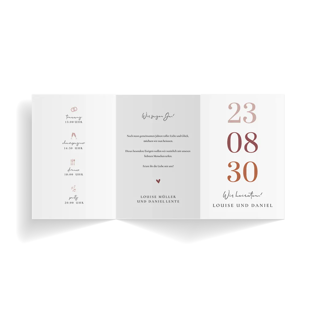 Minimalistische Hochzeitskarte mit elegantem Text. Personalisieren Sie Ihr Design in unserem Online-Editor.