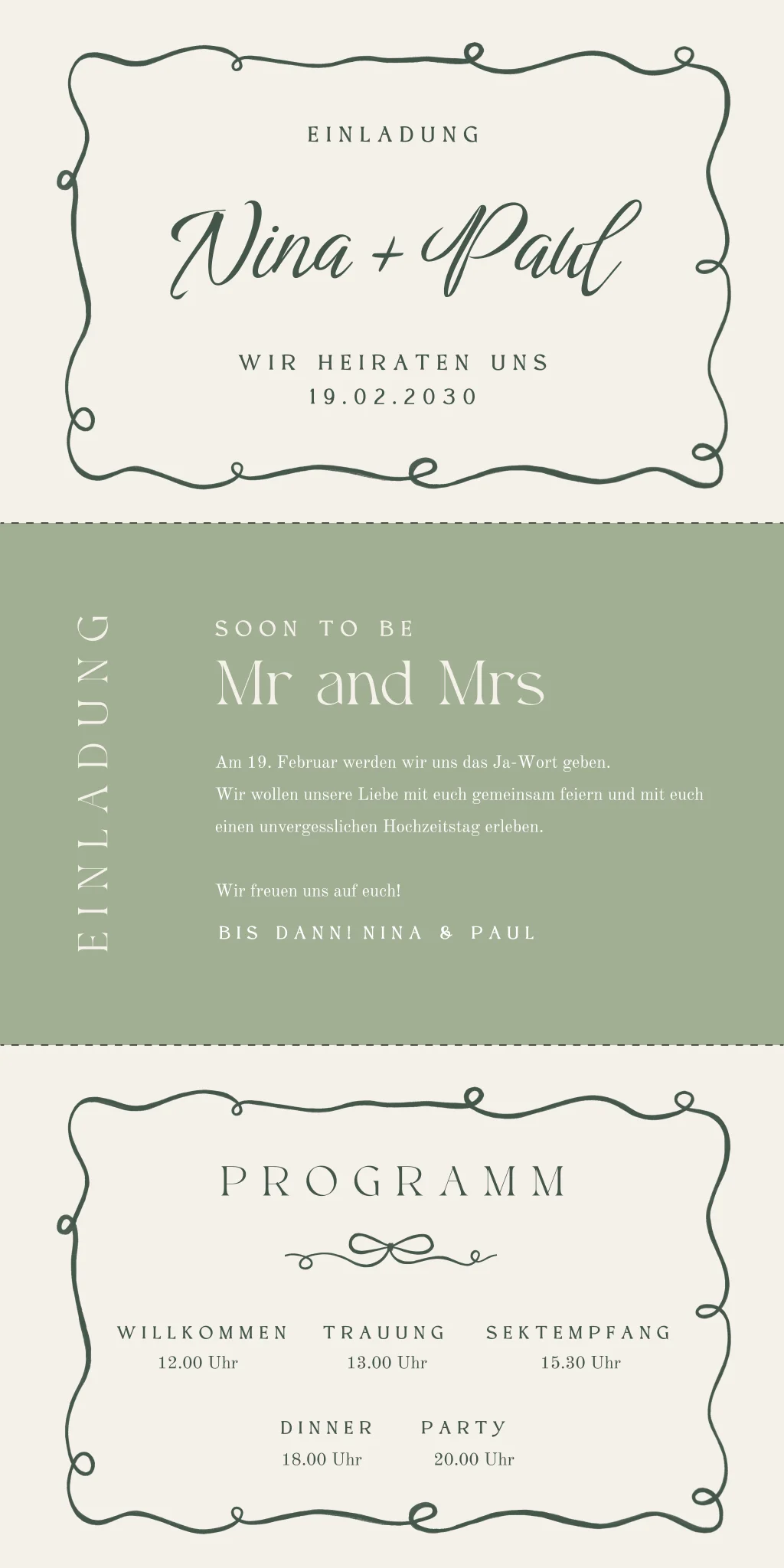 Personalisiere deine Hochzeitseinladung in Grün, ideal für eure Feier. Jetzt im Editor anpassen und unvergesslich machen.