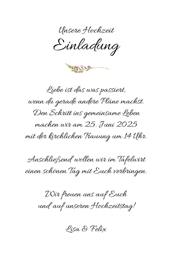 Zarte Wildblumen umrahmen eure Name und euer Wunschdatum und lassen eure Gäste wissen, dass der größte Tage eures Lebens bevorsteht. Sucht euer Lieblingsfoto heraus und platziert es in der Hochzeitseinladungskarte, um eurer Liebe Ausdruck zu verleihen.