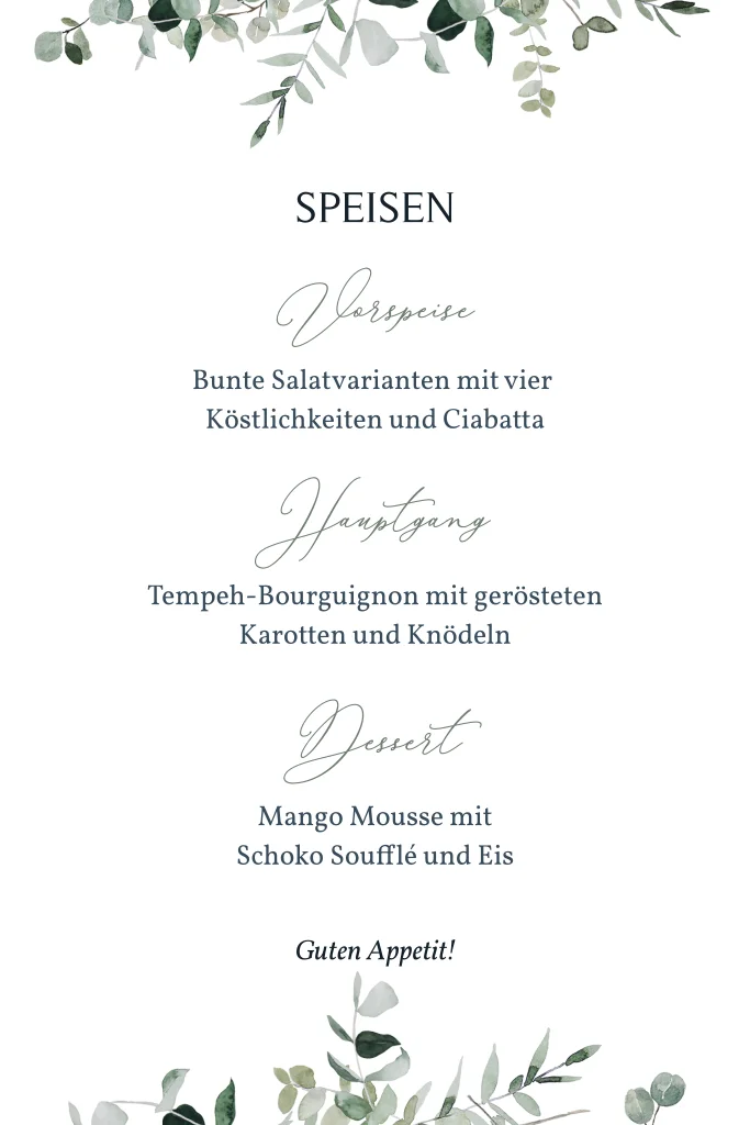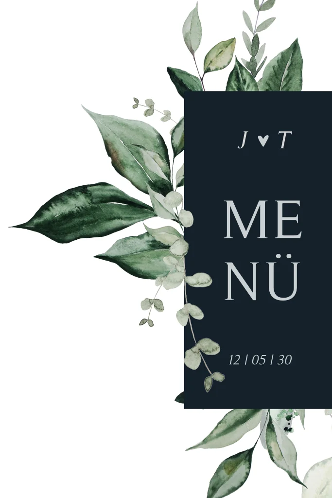 Hübsches Blattwerk und Eukalyptus auf dunkelblau umschmeicheln eure Menükarte. Führt auf, welche Menüabfolge an eurem großen Tag auf dem Plan steht und über welches Getränkeangebot sich eure Gäste freuen dürfen. Guten Appetit!