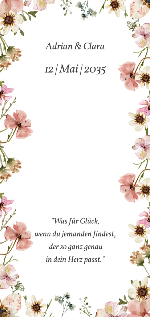Und es hat Bloom gemacht. Passend zur euren Einladungskarten findet ihr eure Menükarte mit zauberhaften Blumenranken. Führt auf, welche Menüabfolge an eurem großen Tag auf dem Plan steht und auf welche kulinarischen Highlights sich eure Gäste freuen können. Guten Appetit!