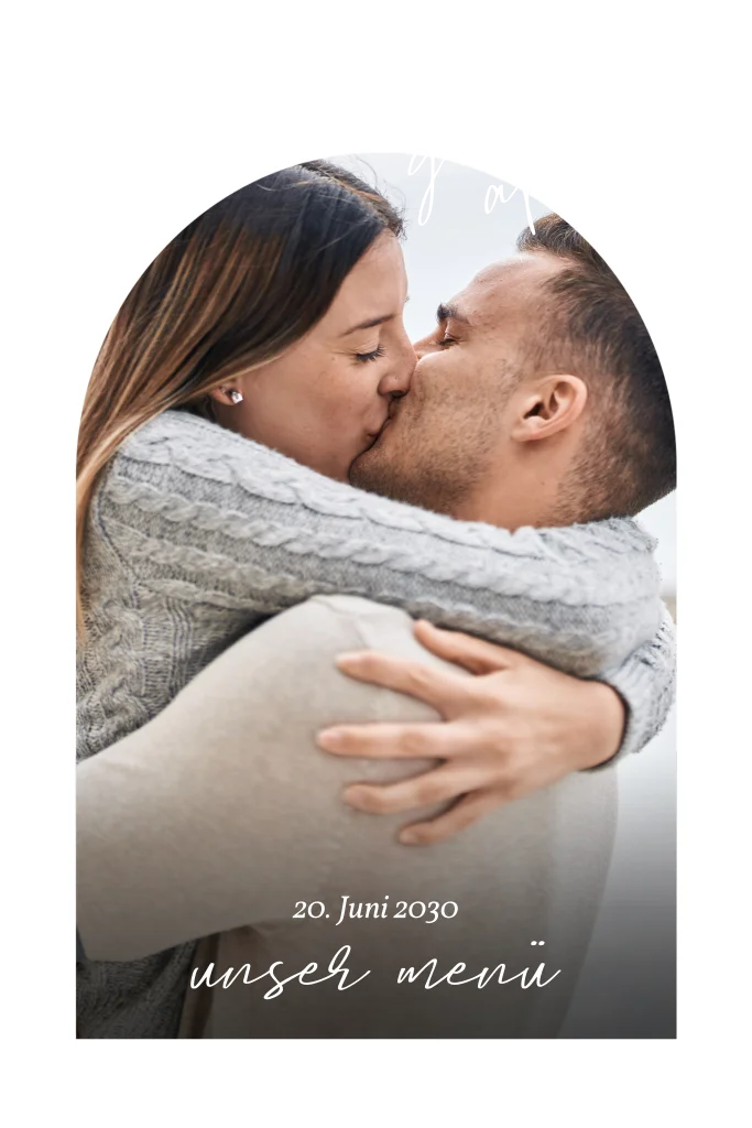 Euer Liebesschnappschuss in dem eleganten Bogen und eure Namen in eine unserer Textveredelungen machen diese Menükarte zu einem echten Hingucker. Führt auf, welche Menüabfolge an eurem großen Tag auf dem Plan steht und über welches Getränkeangebot sich eure Gäste freuen dürfen. Guten Appetit!