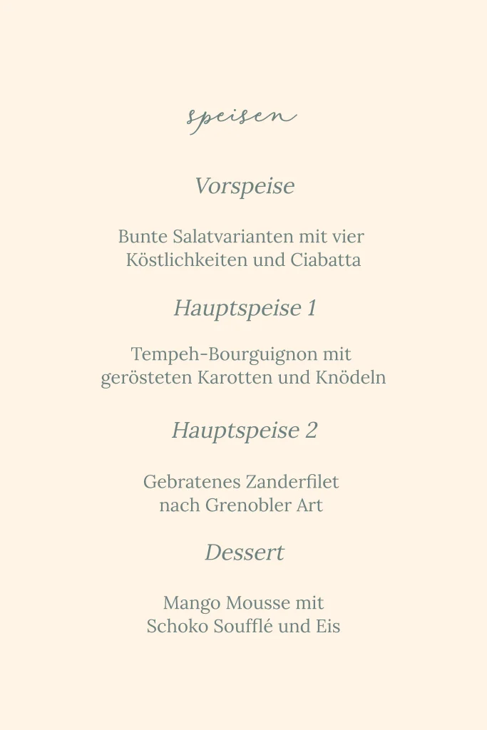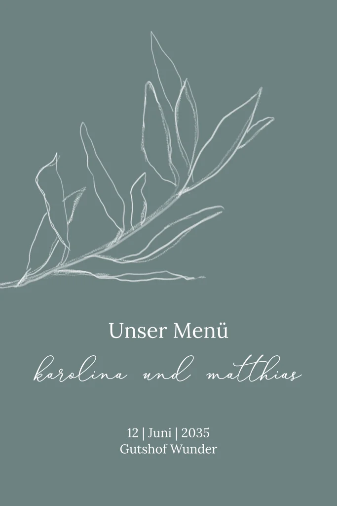 Passend zur Einladungskarte. Schlicht im grünen Design mit einem weißen Blatt und euren Daten zur Hochzeit führt ihr auf, welche Menüabfolge an eurem großen Tag auf dem Plan steht und über welches Getränkeangebot sich eure Gäste freuen dürfen. Guten Appetit!