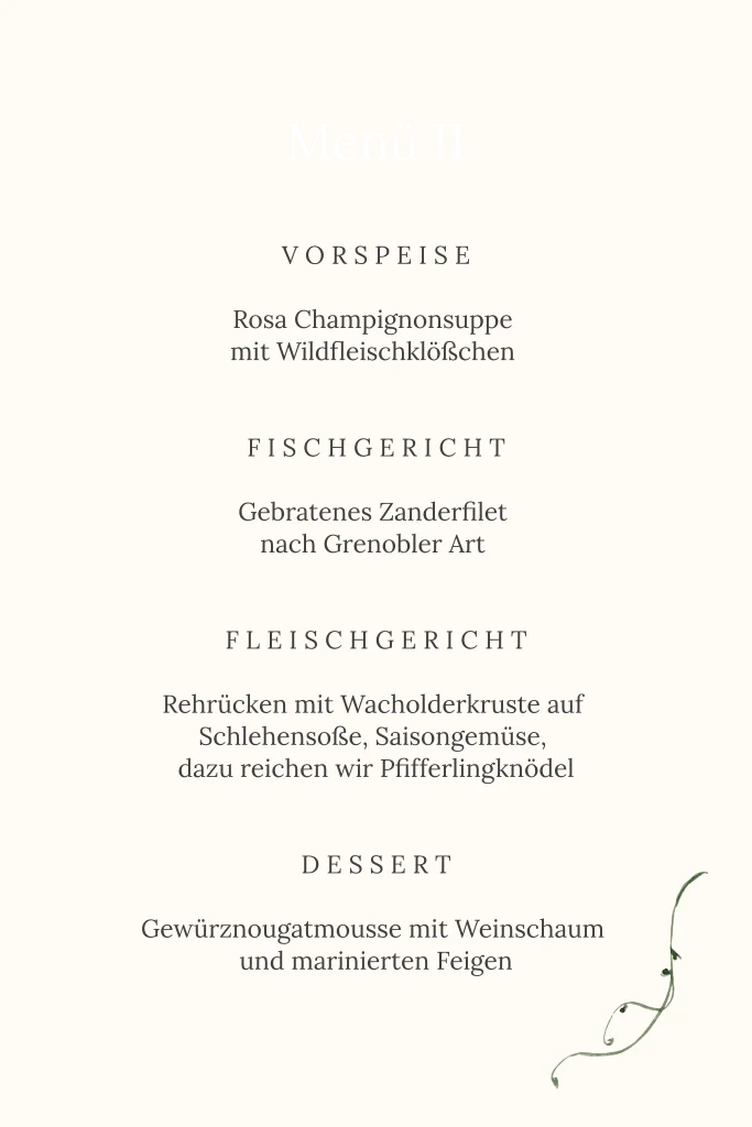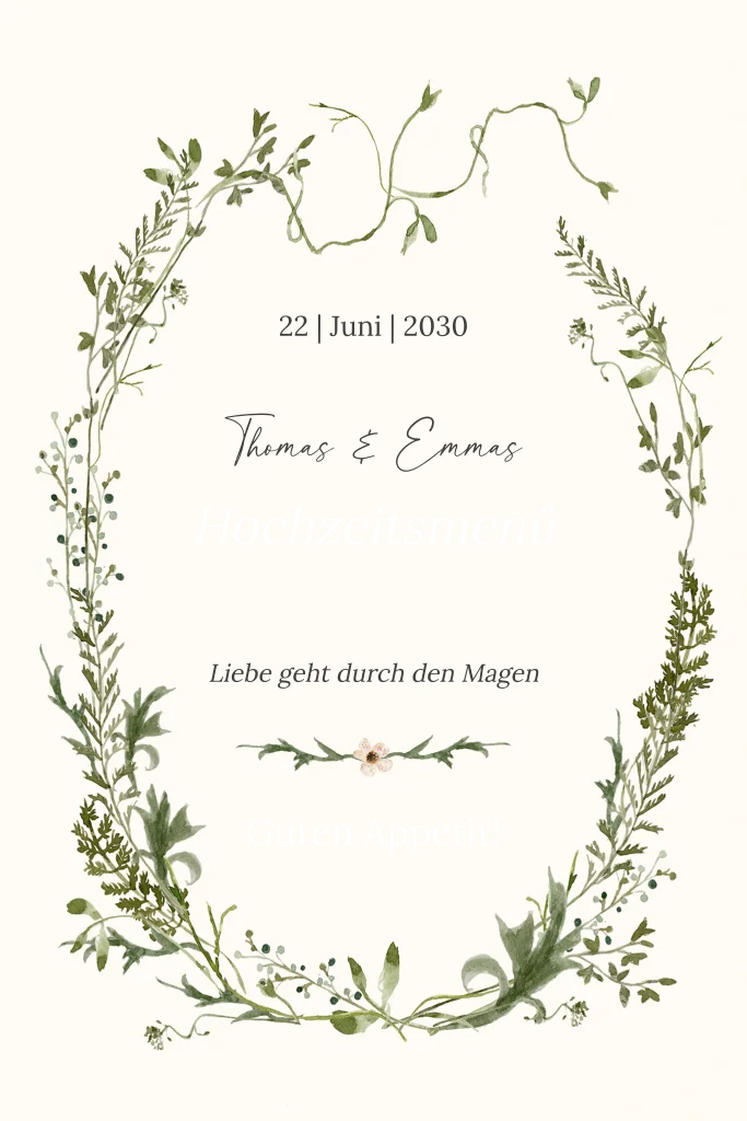 Die botanische Menükarte mit zartem Grün auf beigen Hintergrund umrankt euer Hochzeitsmenü passend zu euren Einladungskarten. Führt auf, welche Menüabfolge an eurem großen Tag auf dem Plan steht und über welches Getränkeangebot sich eure Gäste freuen dürfen. Guten Appetit!