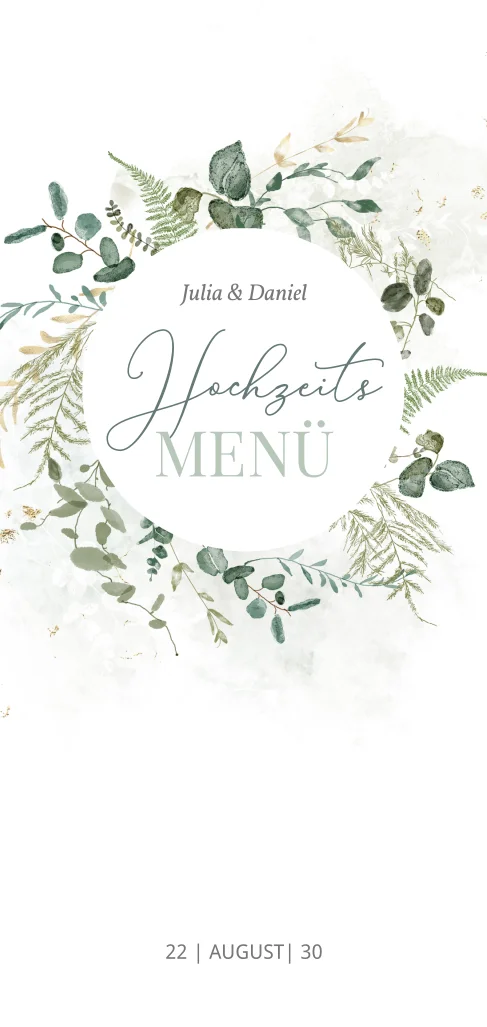 Eine elegante botanische Menükarte mit Eukalyptusrankeln passend zur euren Einladungskarten. Führt auf, welche Menüabfolge an eurem großen Tag auf dem Plan steht und auf welche kulinarischen Highlights sich eure Gäste freuen können. Guten Appetit!