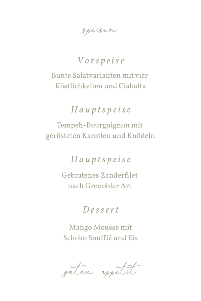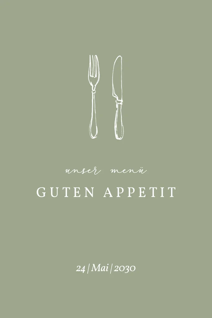 Das Besteck liegt bereit und die Gläser möchten aufgefüllt werden. Wählt eine Hintergrundfarbe und führt in dieser Menükarte, von Lieblichkeit geküsst, auf, welche Menüabfolge an eurem großen Tag auf dem Plan steht und über welches Getränkeangebot sich eure Gäste freuen dürfen. Guten Appetit!