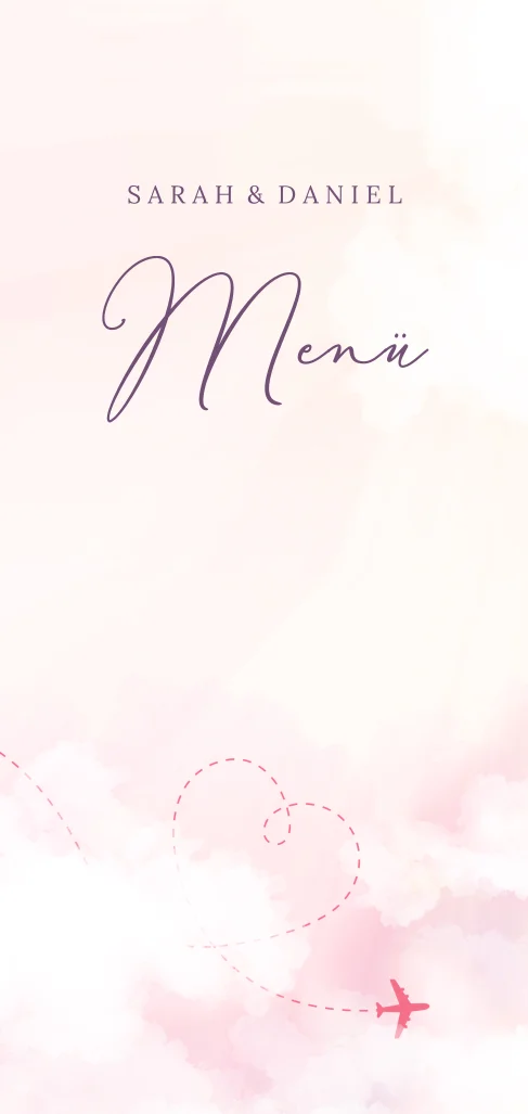 Ihr habt immer noch die rosarote Brille auf. Die Menükarte mit rosanem Wolkenaquarell passt hervorragend zu euren Einladungskarten. Führt auf, welche Menüabfolge an eurem großen Tag auf dem Plan steht und womit ihr den Gaumen eurer Gäste verwöhnt. Guten Appetit!