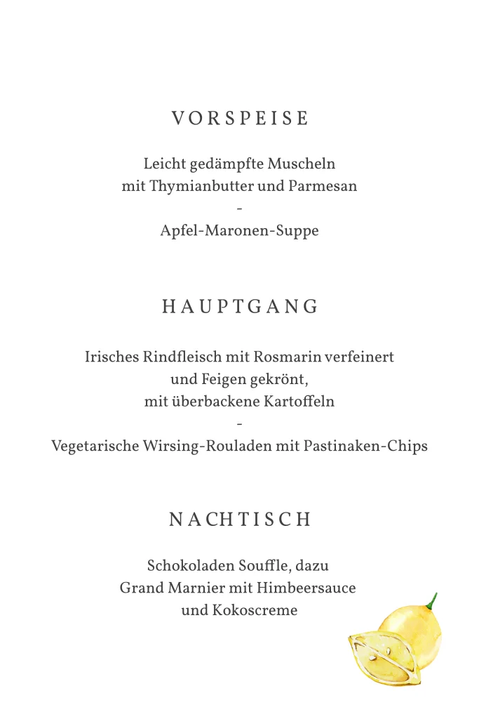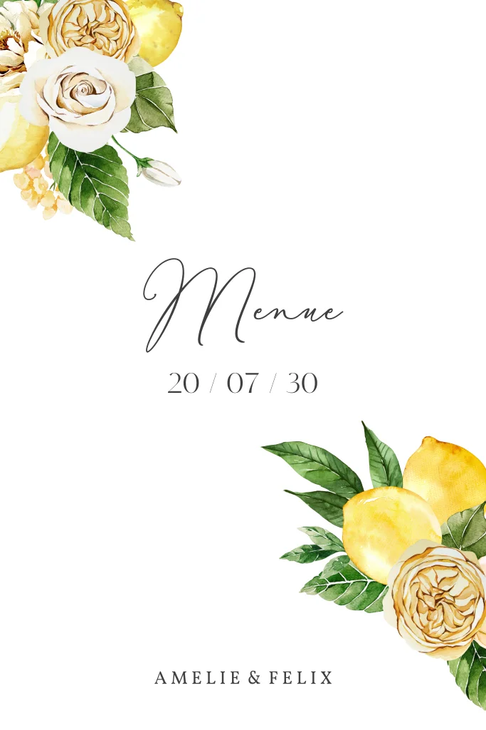 Euer Menü ist etwas mediterran? Dann passt diese Karte mit Zitronen und Blüten super. Gestalte diese Menükarte und schreibe auf den Innenseiten, was es leckeres zu Essen und Trinken geben wird.