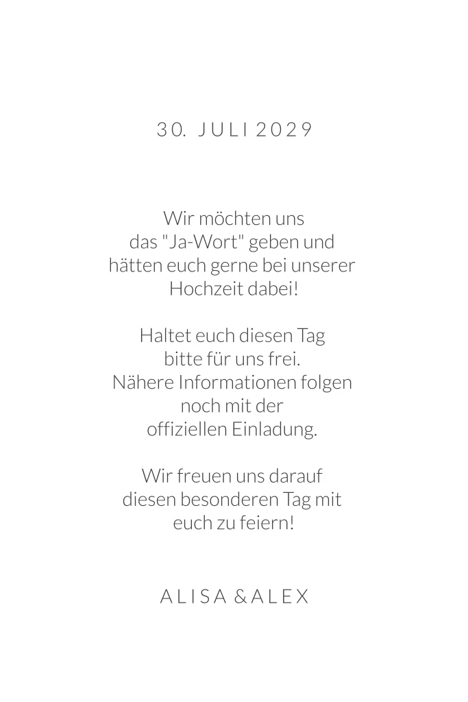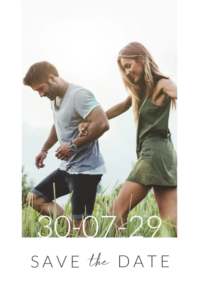 Euer Lieblingsfoto in dem Bildfenster mit eurem Hochzeitsdatum und dem Schriftzug Save the Date. Informiert eure Gäste rechtzeitig über den Termin für den wichtigsten Tag eures Lebens, damit sie ihn reservieren können und er ein fester Bestandteil ihres Terminplaners wird.