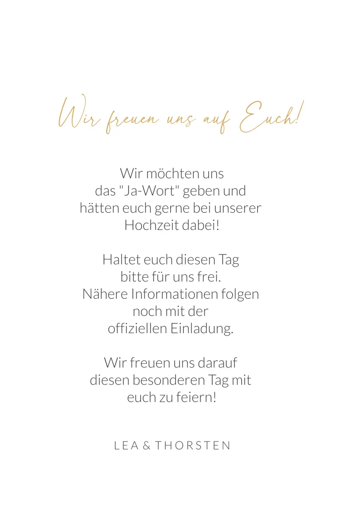 Eine traumhafte Save the Date Karte mit goldener Schrift. Save the Date in Goldoptik auf deinem Lieblingsfoto verleiht dieser Ankündigung eures Hochzeitstermins das gewisse Etwas und entzückt deine Liebsten im Nu. Freut euch auf einen unvergesslichen Tag.