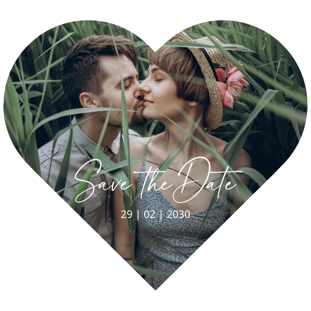 Mit dieser Save the Date Karte in Herzform kündigt ihr euer Hochzeitsdatum auf eurem Lieblingsfoto an. Informiert eure Gäste rechtzeitig über den Termin für den wichtigsten Tag eures Lebens, damit sie ihn reservieren können und er ein fester Bestandteil ihres Terminplaners wird.