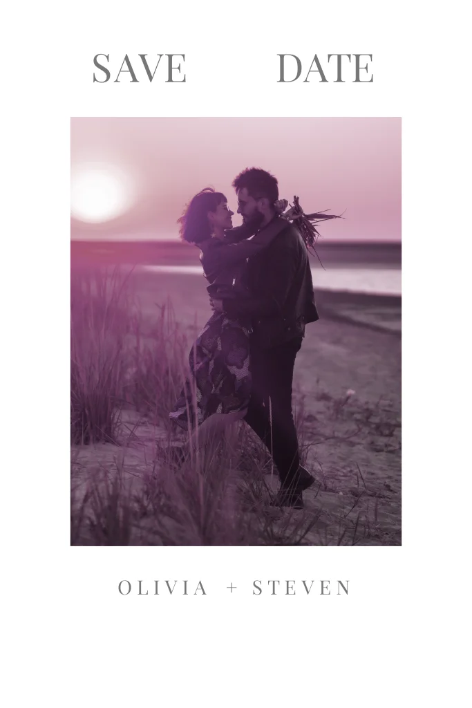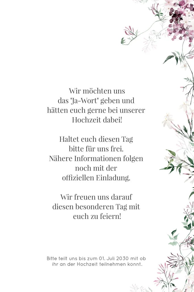 Mit eurem Lieblingsfoto bringt ihr eure blühende Liebe zum Ausdruck und versendet mit dieser Save the Date Karte euer Hochzeitsdatum. Dekorativ und romantisch kündigen die zarten Blumen im Inneren an, dass ihr heiratet und dass ihr darum bittet, dass eure Lieben sich den Tag frei halten.