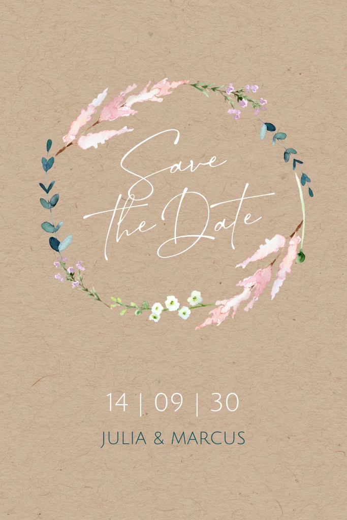 Verkünde euren besonderen Tag mit dieser eleganten Save the Date Karte. Passe das florale Design in unserem Editor an.