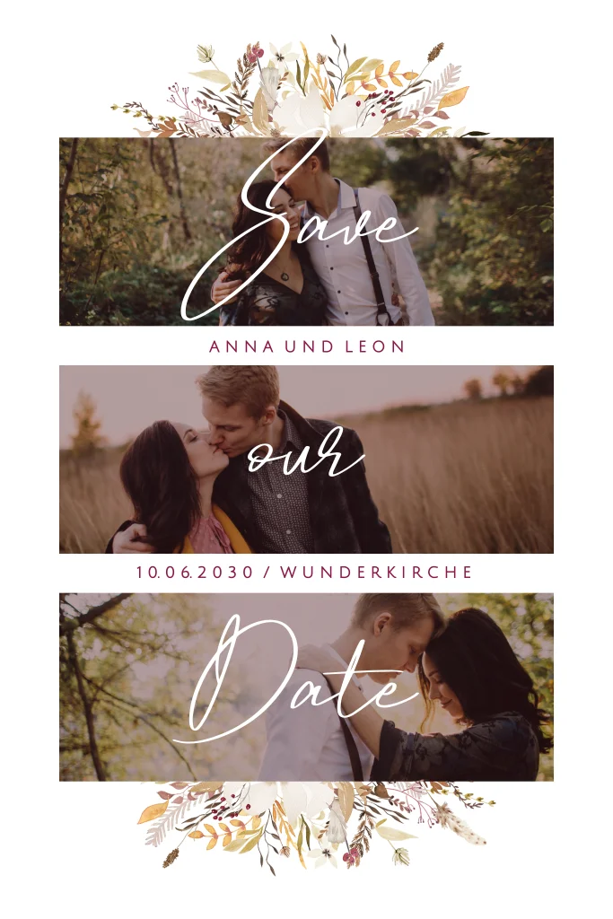 Eure Lieblingsfotos gekrönt von Trockenblumen Gestecken und dem Schriftzug Save our Date. Informiert eure Gäste rechtzeitig über den Termin für den wichtigsten Tag eures Lebens, eurer Hochzeit, damit sie ihn reservieren können und er ein fester Bestandteil ihres Terminplaners wird.