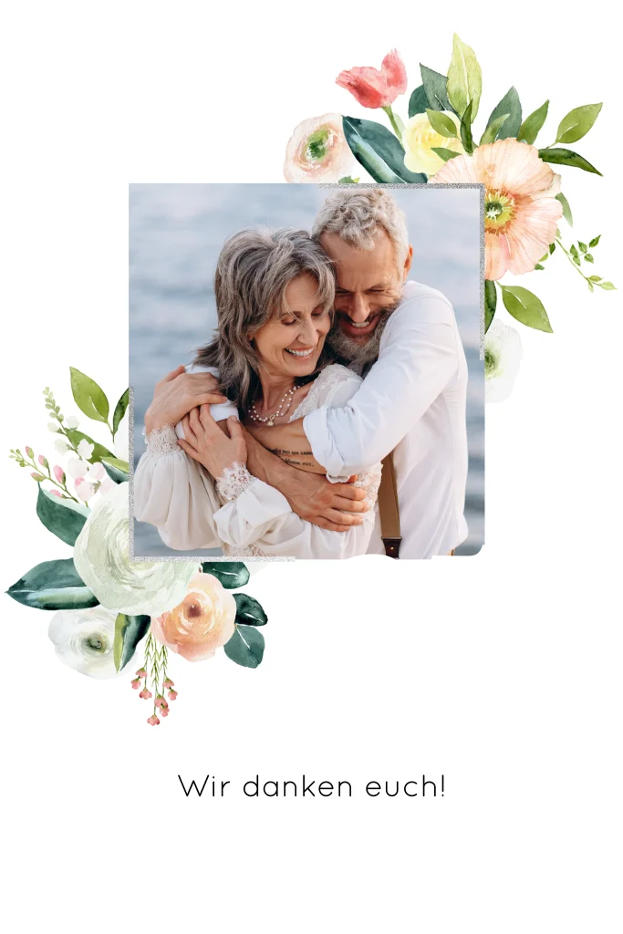 25 Jahre voller Glück. Rosige Zeiten mit Höhen und Tiefen. Ein Grund eure Silberhochzeit zu feiern. Ladet mit dieser blumigen Karte zu eurer Jubiläumsfeier mit all euren Liebsten ein. Feiert mit euren Gästen eure Liebe, eure zauberhaften Kinder und Enkelkinder.